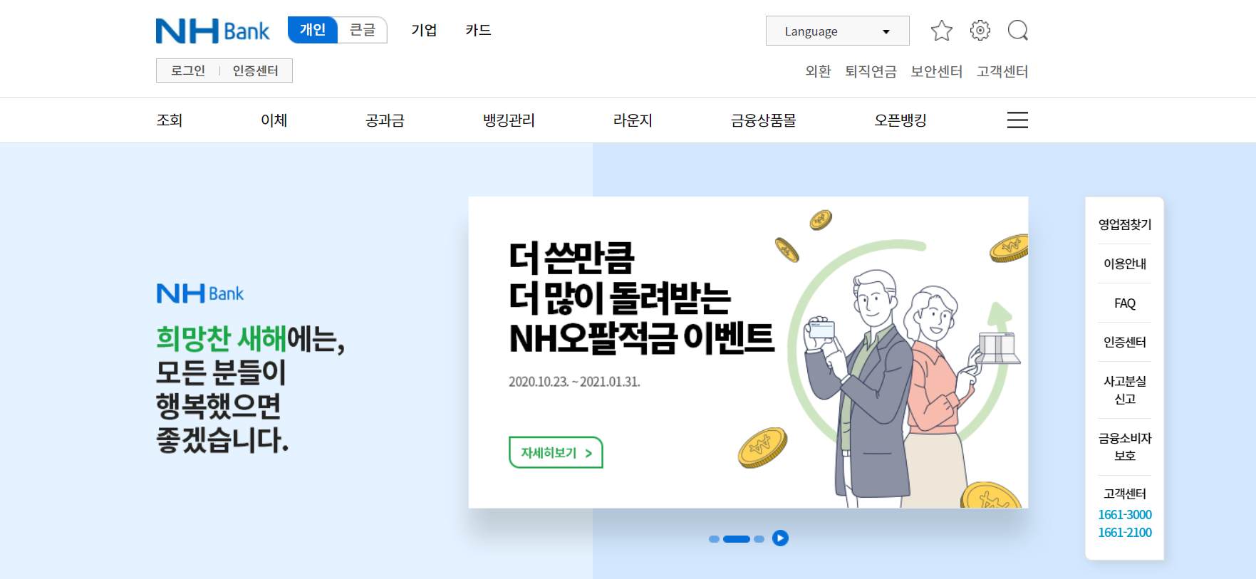 농협은행은 아래처럼 내가 필요한 정보를 클릭한번으로 알수있어서 이용하기에 편리합니다.