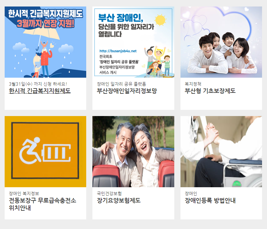부산시청 홈페이지에서 볼 수 있는 복지정보입니다. 유형별 분야별로 다양한 제도가 있으니 한번 쯤 확인하시는 것도 좋은 방법입니다.