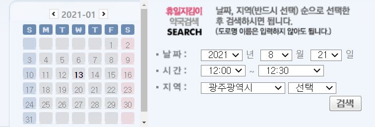 휴일지킴이약국 검색창에 사용자가 방문예정인 날짜와 시간대 그리고 지역을 입력하면 아래와같이 해당일자에 운영하는 약국을 알려줍니다.
