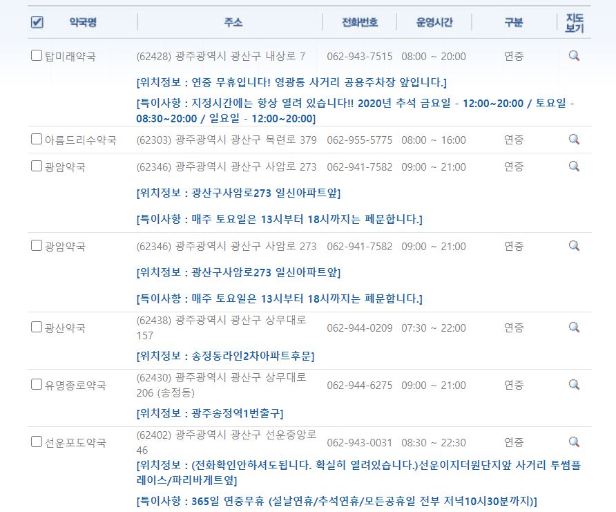 휴일지킴이약국 검색창에 사용자가 방문예정인 날짜와 시간대 그리고 지역을 입력하면 아래와같이 해당일자에 운영하는 약국을 알려줍니다.